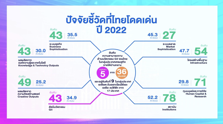 NIA เผยไทยครองอันดับ 43 ดัชนีนวัตกรรมโลกปี 2565 พร้อมนั่งแท่นแชมป์โลกด้านสัดส่วนการลงทุน R&D ของเอกชน - การส่งออกสินค้าสร้างสรรค์ เร่งผลักดัน “นวัตกรรม” เป็นวาระแห่งชาติ พร้อมพาประเทศไทยสู่ชาตินวัตกรรม