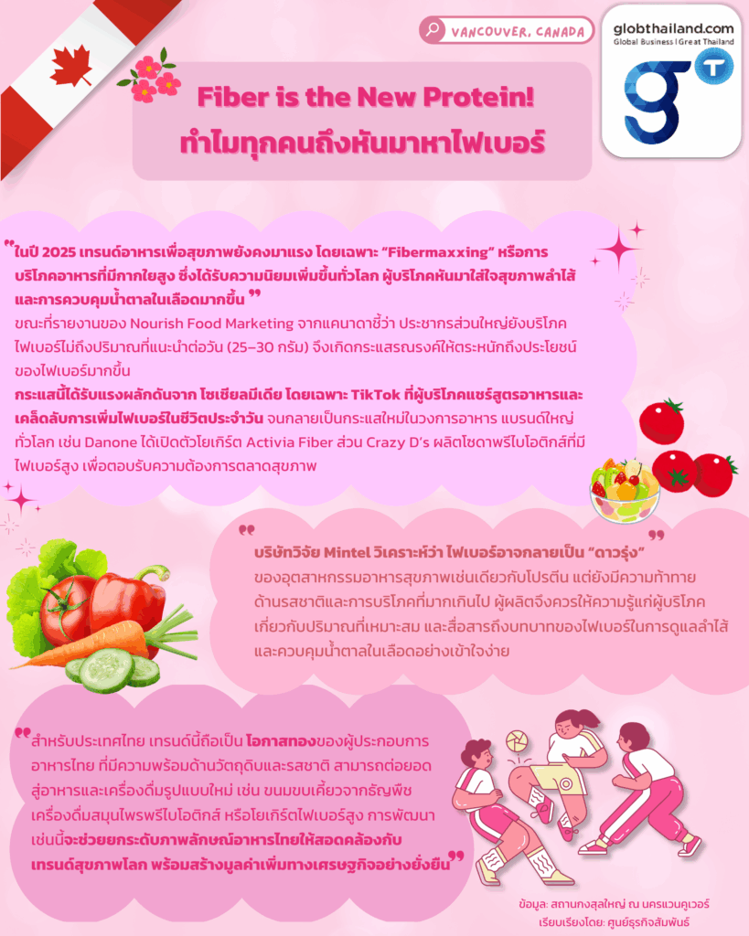 ตามรายงานของ Nourish Food Marketing ประเทศแคนาดา ชี้ว่าเทรนด์อาหารที่กำลังมาแรงในปี 2025 นอกเหนือจากอาหารที่มีโปรตีนสูงแล้ว คือ อาหารที่มีกากใย (ไฟเบอร์) สูง เนื่องจากผู้บริโภคให้ความสำคัญกับสุขภาพลำไส้และการควบคุมน้ำตาลในเลือดมากขึ้น นักโภชนาการแคนาดาพบว่าชาวแคนาดาส่วนใหญ่บริโภคไฟเบอร์ไม่ถึงปริมาณที่แนะนำต่อวัน (25–30 กรัม) จึงมีการรณรงค์เผยแพร่ถึงประโยชน์ของไฟเบอร์และบทบาทสำคัญต่อสุขภาพระบบทางเดินอาหารและจุลินทรีย์ในลำไส้อย่างต่อเนื่อง