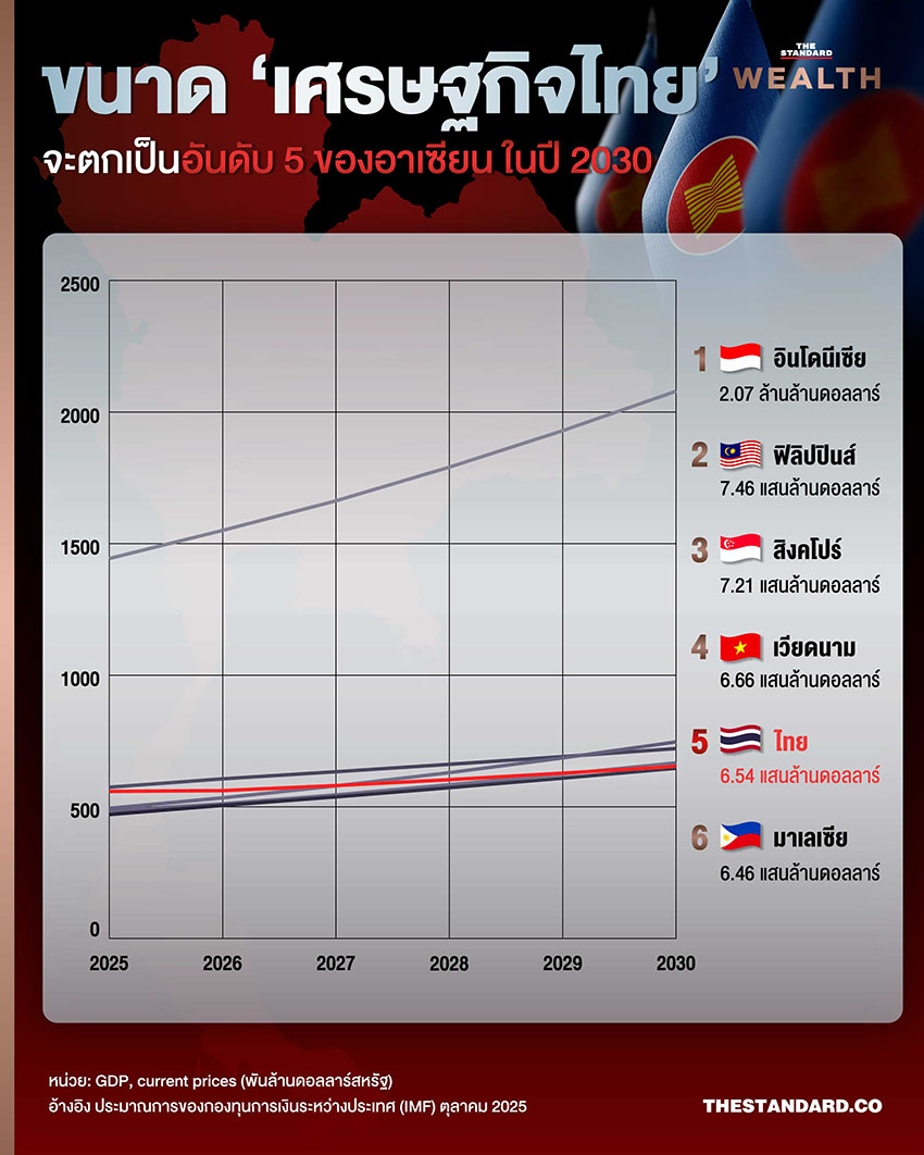 อย่างไรก็ตาม ในปี 2030 หรืออีกราว 5 ปีข้างหน้า IMF ประมาณการว่า ขนาดเศรษฐกิจไทย จะตกไปอยู่อันดับที่ 5 ของอาเซียน หลังถูกฟิลิปปินส์และเวียดนามแซง