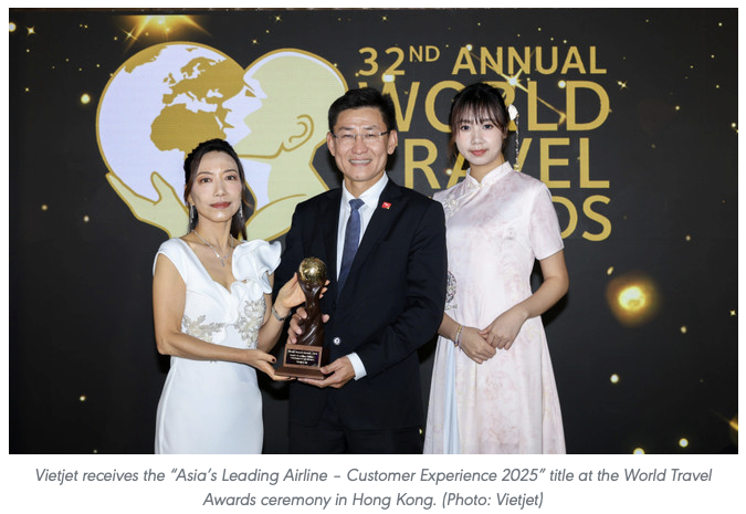 เวียตเจ็ทได้ยืนยันตําแหน่งอีกครั้งในฐานะสายการบินยุคใหม่ชั้นนําของเอเชีย โดยคว้าตําแหน่ง "สายการบินชั้นนําของเอเชีย - ประสบการณ์ลูกค้า 2025" ในพิธี World Travel Awards (WTA) อันทรงเกียรติที่จัดขึ้นในฮ่องกง (จีน)