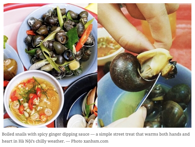 เรียบง่ายแต่ไม่อาจต้านทานได้ ốc luộc (หอยทากต้ม) เป็นอาหารอันโอชะในฤดูหนาวที่คนในท้องถิ่นชื่นชอบ เดินเล่นไปตามตรอกซอกซอยหรือลานอพาร์ตเมนต์เก่า และเป็นเรื่องง่ายที่จะพบกลุ่มเพื่อนที่ซุกตัวอยู่บนเก้าอี้เตี้ย พูดคุยและหัวเราะกับชามหอยทากที่ร้อนระอุ