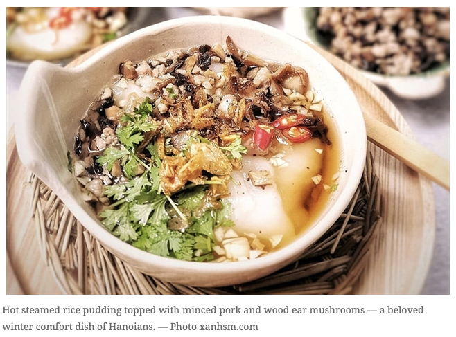 ในบรรดาอาหารฤดูหนาวมากมายของฮานอย Bánh đúc nóng โดดเด่นด้วยรสชาติที่เรียบง่ายแต่อบอุ่นหัวใจ จานนี้ทําจากแป้งข้าวเจ้าบดสด นึ่งจนเนียนและยืดหยุ่นเล็กน้อย จากนั้นราดด้วยหมูสับผัด เห็ดหูไม้ และหอมแดงทอดหอม