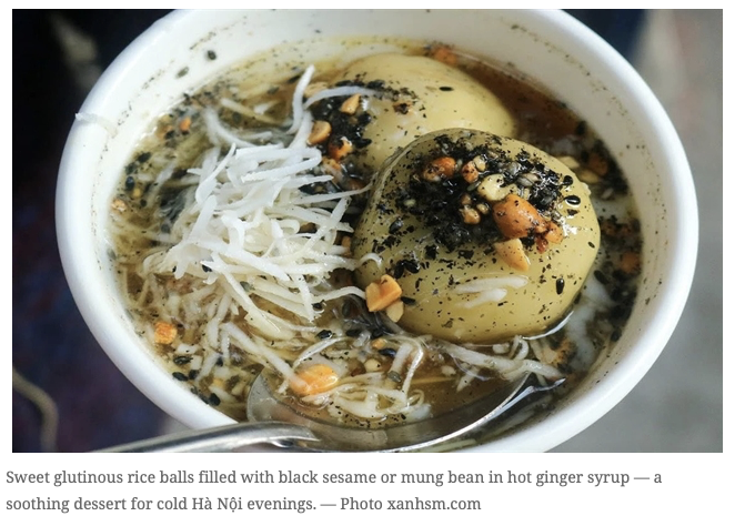 ช่วงเย็นของฤดูหนาวจะไม่สมบูรณ์หากไม่มี bánh trôi tàu สักชาม ซึ่งเป็นข้าวปั้นข้าวเหนียวที่เสิร์ฟพร้อมน้ําเชื่อมขิงร้อนๆ อาหารจานนี้ทั้งไพเราะและอร่อย