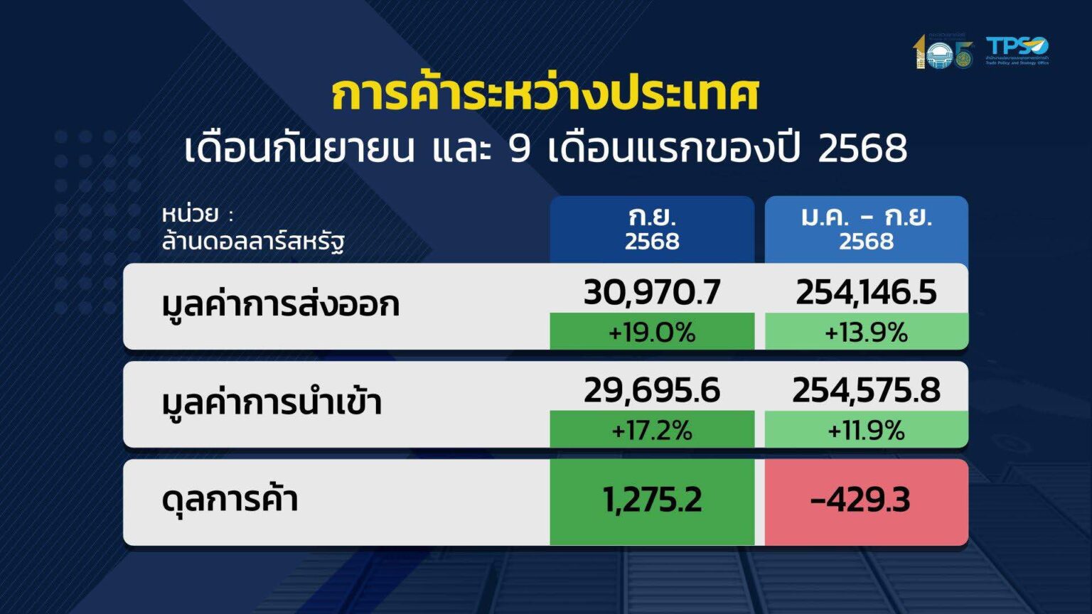 สนค.เผยไทยมูลค่าส่งออกเดือน ก.ย. ฟื้นตัวแข็งแกร่งเกินคาด ขยายตัว 19.0% สูงสุดในรอบ 42 เดือน จากอุปสงค์สินค้าอุตสาหกรรมที่เติบโตต่อเนื่อง ท่ามกลางแรงกดดันทางการค้าโลก และคาดว่าการส่งออกโค้งสุดท้ายจะขยายตัว ทั้งปีมีลุ้นไทยส่งออกโต 10.4%