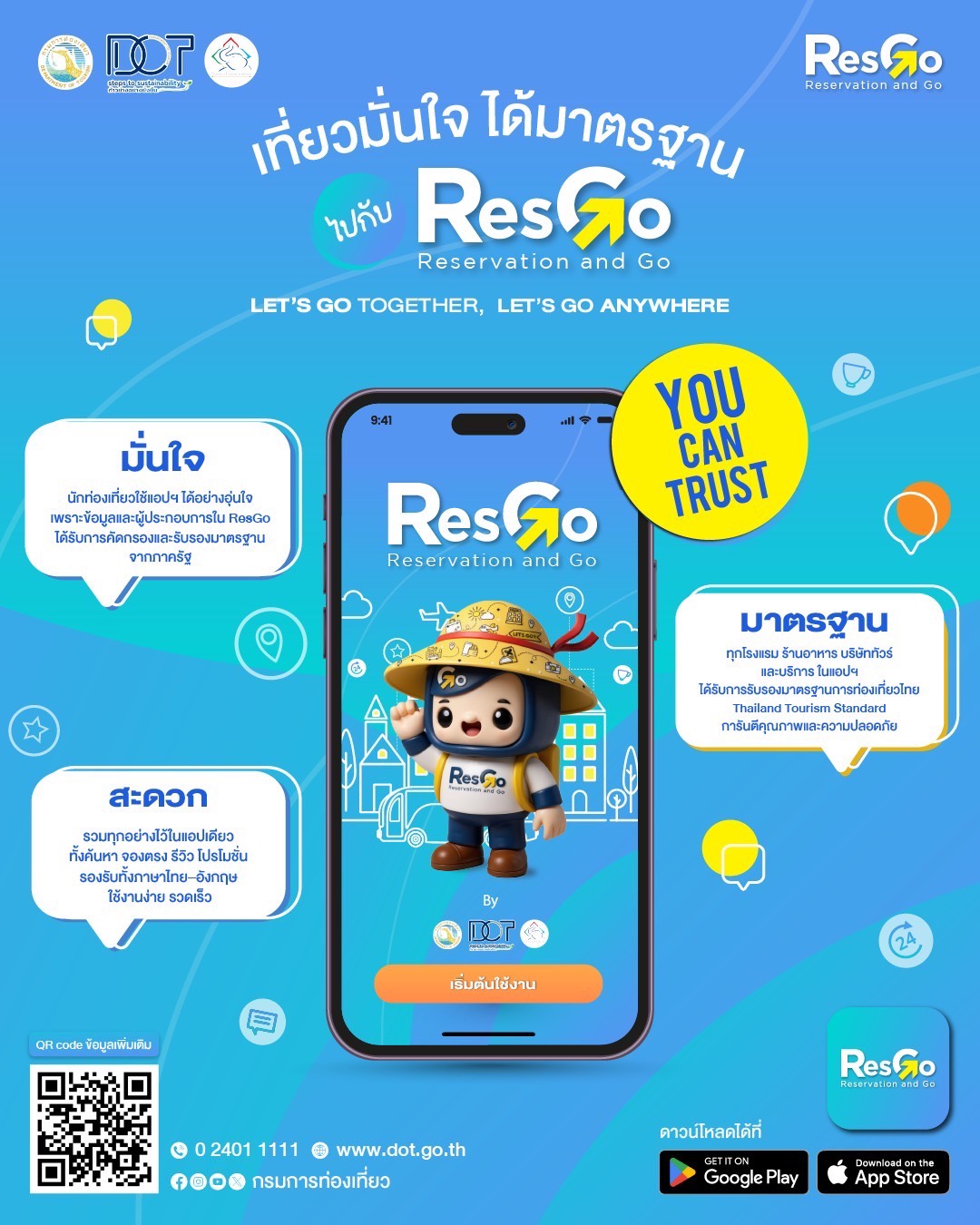 นอกจากนี้ กรมการท่องเที่ยวยังได้พัฒนาแอปพลิเคชั่น “ResGo (Reservation and Go)” ภายใต้แนวคิด “Let’s go together, Let’s go anywhere” หรือ “เที่ยวมั่นใจได้มาตรฐานไปกับ ResGo” แอปพลิเคชั่นที่รวบรวมสินค้าและบริการด้านการท่องเที่ยวที่ผ่านการรับรองมาตรฐานการท่องเที่ยวไทย ซึ่งนักท่องเที่ยวสามารถเข้าถึงข้อมูลได้ง่าย มีความน่าเชื่อถือ และดาวน์โหลดใช้งานได้ทั้งระบบ iOS และ Android