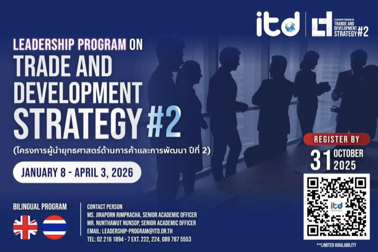 สถาบันระหว่างประเทศเพื่อการค้าและการพัฒนา (องค์การมหาชน) หรือ ITD สังกัดกระทรวงพาณิชย์ เดินหน้าขับเคลื่อนพันธกิจสำคัญในการยกระดับศักยภาพของประเทศ ด้วยการเปิดตัว โครงการผู้นำยุทธศาสตร์ด้านการค้าและการพัฒนา รุ่นที่ 2 (Leadership Program on Trade and Development Strategy: LTD#2) ภายใต้แนวคิด “A Call to Leadership: Navigating a New Era of Global Trade” มุ่งเปิดพื้นที่ให้ ผู้ที่มีส่วนได้ส่วนเสียจากภาครัฐและเอกชน ได้ร่วมกัน คิด วิเคราะห์ และเสนอแนวทางเชิงนโยบาย ที่จะก่อประโยชน์ต่อการพัฒนาประเทศอย่างมั่นคงและยั่งยืน