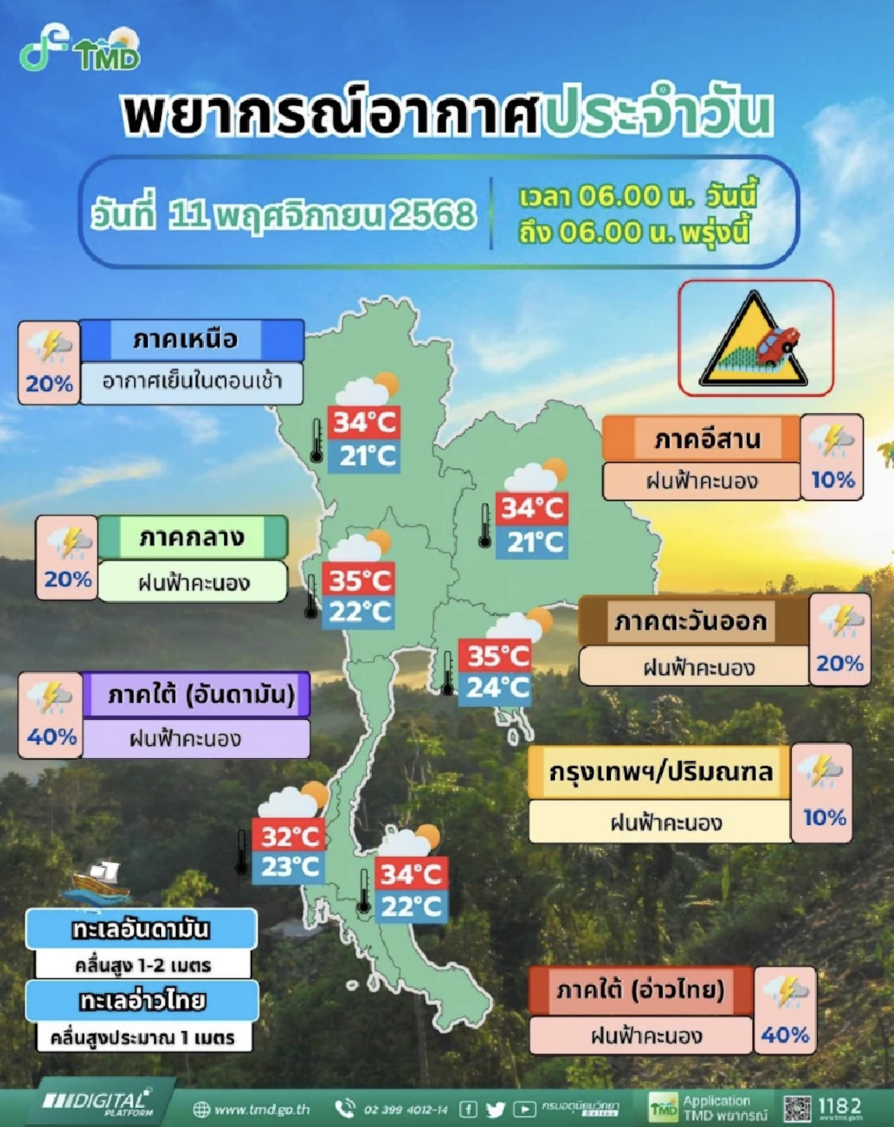 วันที่ 11 พฤศจิกายน 2568 กรมอุตุนิยมวิทยา อัปเดตเส้นทางพายุและภาพถ่ายดาวเทียมช่วงเช้าวันนี้ ทั่วไทยท้องฟ้าเช้าวันนี้ เมฆฝนมีน้อยลง ส่วนใหญ่เป็นเมฆชั้นกลาง ชั้นสูง ส่วนพายุ"ฟงวอง" (Fung-wong) ได้อ่อนกำลังลงจากพายุไต้ฝุ่นเป็นพายุโซนร้อนกำลังแรง กำลังเคลื่อนตัวทางทิศเหนือ และตะวันออกเฉียงเหนือ คาดว่าจะเคลื่อนสู่เกาะไต้หวัน ในช่วงวันที่ 12-13 พ.ย. 68 และจะอ่อนกำลังลงอีก โดยพายุนี้ไม่เคลื่อนเข้าสู่ประเทศไทย ขอให้ผู้ที่จะเดินทางไปบริเวณดังกล่าวตรวจสอบสภาพอากาศก่อนออกเดินทางในช่วงวันดังกล่าวไว้ด้วย