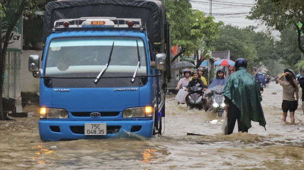 ฝนตกหนักในเมืองเว้ทําให้เกิดน้ําท่วมและแผ่นดินถล่มอย่างกว้างขวาง ทําให้โรงเรียนต้องปิดและปิดกั้นถนน