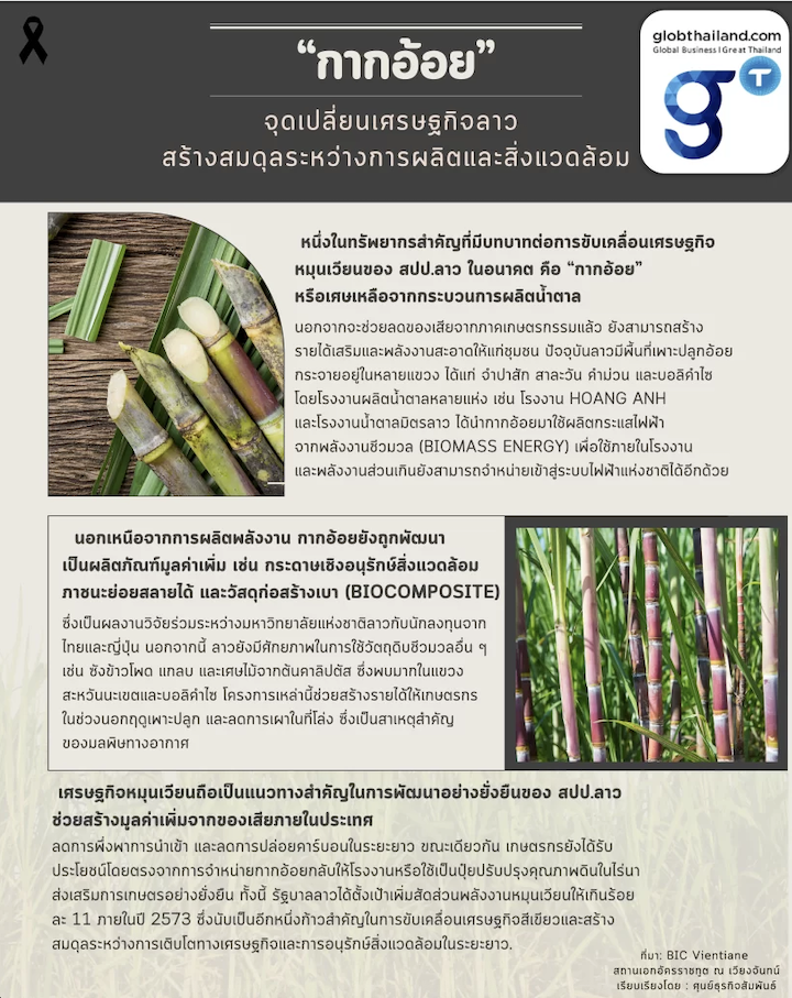 ในด้านการกระจายรายได้สู่ชุมชน เกษตรกรได้รับประโยชน์โดยตรงจากการจำหน่ายกากอ้อยกลับให้โรงงาน หรือการนำกากอ้อยไปใช้ผลิตปุ๋ยเพื่อปรับปรุงคุณภาพดินในไร่นาของตน ซึ่งช่วยลดต้นทุนการผลิตและส่งเสริมการทำเกษตรกรรมอย่างยั่งยืน พร้อมกันนี้ รัฐบาลลาวยังได้ให้ความสำคัญต่อการพัฒนาพลังงานหมุนเวียน โดยมีเป้าหมายเพิ่มสัดส่วนของพลังงานหมุนเวียนในโครงสร้างพลังงานของประเทศให้มากกว่าร้อยละ 11 ภายในปี พ.ศ. 2573 ซึ่งนับเป็นอีกหนึ่งก้าวสำคัญของลาวในการขับเคลื่อนเศรษฐกิจสีเขียว และสร้างสมดุลระหว่างการเติบโตทางเศรษฐกิจและการอนุรักษ์สิ่งแวดล้อมอย่างยั่งยืน (ข้อมูลจาก : BIC Vientiane สถานเอกอัครราชทูต ณ เวียงจันทน์, เรียบเรียงโดย : ศูนย์ธุรกิจสัมพันธ์)