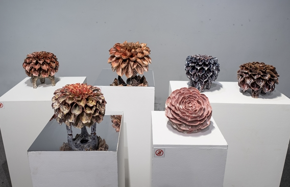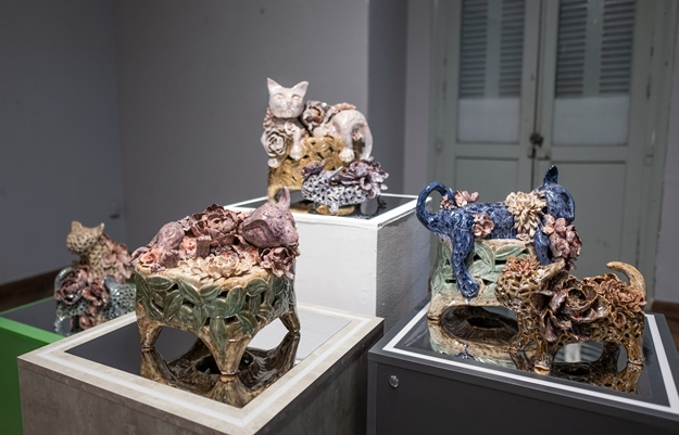 นิทรรศการนี้ยังรวมถึงสัตว์ต่างๆ เช่น แมว ผีเสื้อ ผึ้ง ม้า และช้าง รวมถึงแจกันตกแต่งและชุดน้ําชา แต่ละงานเกี่ยวข้องกับดอกไม้ชนิดหนึ่ง