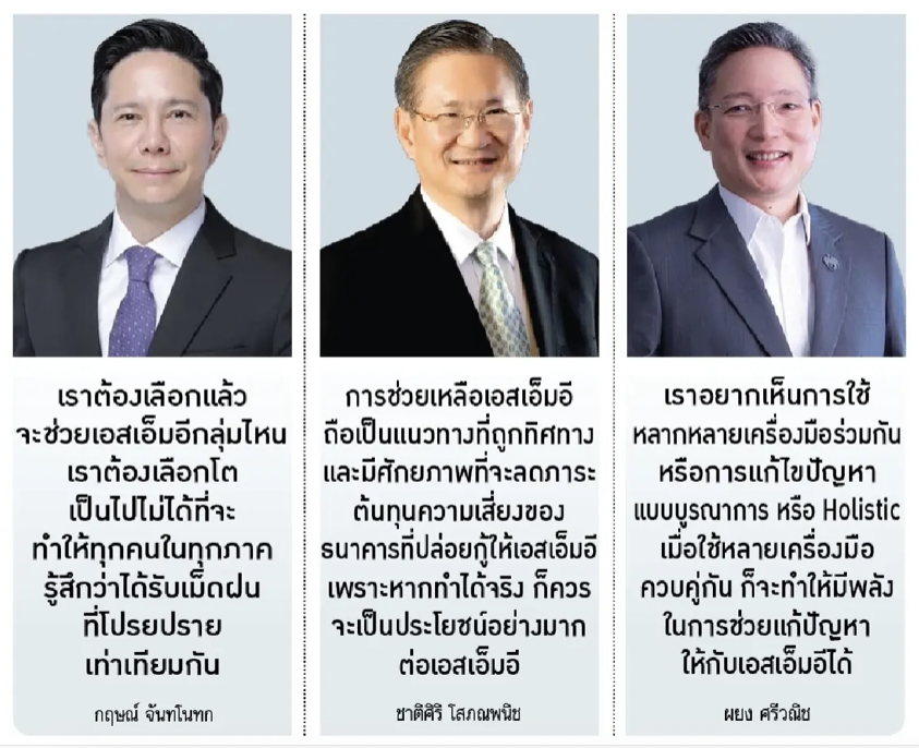 ซึ่งมองว่า เมื่อการแก้ไขปัญหาแบบบูรณาการ หลายเครื่องมือควบคู่กัน ก็จะทำให้มีพลังในการช่วยแก้ปัญหาให้กับภาคเอสเอ็มอีได้ ทั้งการตอบโจทย์เรื่องทรัพยากร ทักษะ และรูปแบบการทำธุรกิจ และเมื่อธุรกิจกลับมาแข่งขันได้ก็จะมาสู่รายได้ที่เพิ่มขึ้น และนำมาสู่การชำระหนี้ตามศักยภาพได้ในท้ายที่สุด