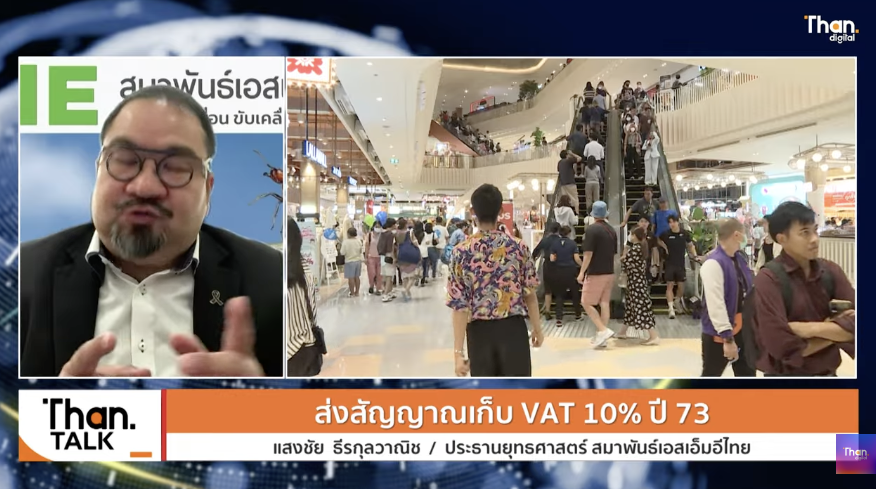 การถกเถียงเรื่องการปรับขึ้นภาษีมูลค่าเพิ่มกลับมาอีกครั้ง หลังรัฐบาลส่งสัญญาณว่า ภายในปี 2571 อาจมีการขยับอัตราภาษีมูลค่าเพิ่ม (VAT) จาก 7% เป็น 8.5% และอาจทยอยขึ้นไปแตะระดับ 10% ตามแผนในปี 2573 ล่าสุด แสงชัย ธีรกุลวาณิช ประธานยุทธศาสตร์สมาพันธ์เอสเอ็มอีไทย ให้สัมภาษณ์ภายในรายการ 'ฐานทอล์ค' ว่า การประกาศแผนล่วงหน้าเป็น 'เรื่องที่ดี' เพราะช่วยให้ภาคเอกชนและประชาชนสามารถเตรียมความพร้อมได้ แต่การจะเดินหน้าเก็บ VAT เพิ่มให้สำเร็จ รัฐต้องแก้ปัจจัยสำคัญ 5 ประการควบคู่กันไป