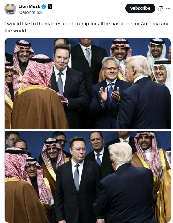 ในโพสต์กล่าวว่า “I would like to thank President Trump for all he has done for America and the world” หรือ “ผมอยากขอบคุณประธานาธิบดีทรัมป์ สำหรับทุกสิ่งที่เขาได้ทำเพื่ออเมริกาและโลกใบนี้” โดยโพสต์ดังกล่าวเป็นภาพชุดที่มัสก์ยืนเคียงข้างเจ้าชายซาอุดีอาระเบีย กลุ่มผู้นำด้านความมั่นคง และโดนัลด์ ทรัมป์ ขณะพบปะกันในงานระดับสูง