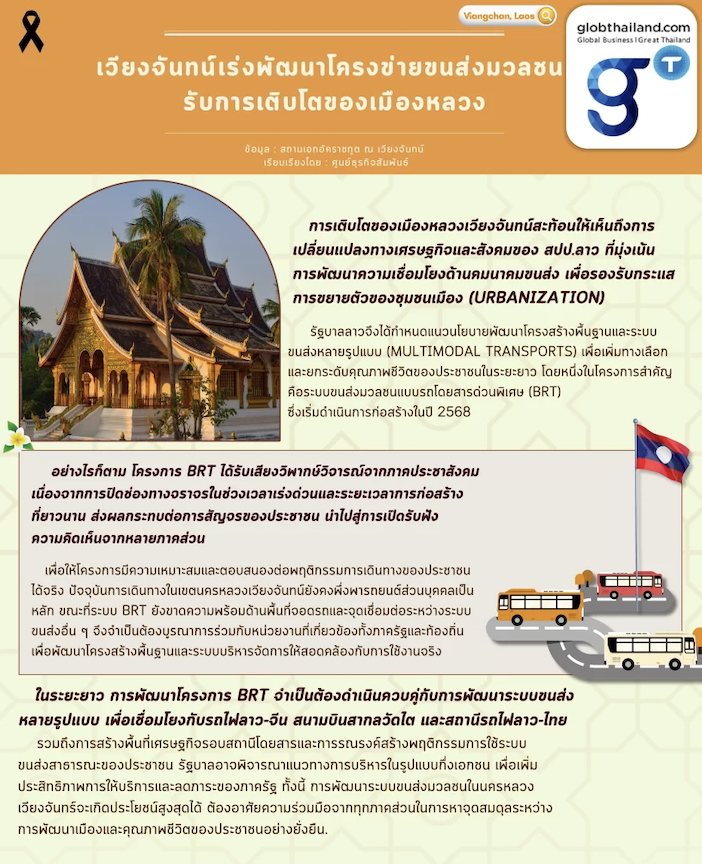 การเติบโตและพัฒนาเมืองสะท้อนการเปลี่ยนแปลงและการเติบโตทางเศรษฐกิจและสปป.ลาว ก็เป็นหนึ่งในประเทศที่มีนโยบายด้านการขนส่งคมนาคมขนส่งและการพัฒนาความเชื่อมโยงเพื่อรองรับการเติบโตของชุมชนเมือง (urbanization) แผนงานของรัฐบาลเพื่อมุ่งเน้นการพัฒนารูปแบบการคมนาคมขนส่งและการเชื่อมโยงการขนส่งหลายรูปแบบ (multimodal transports) เพิ่มทางเลือกให้กับประชาชนในระยะต่อไป