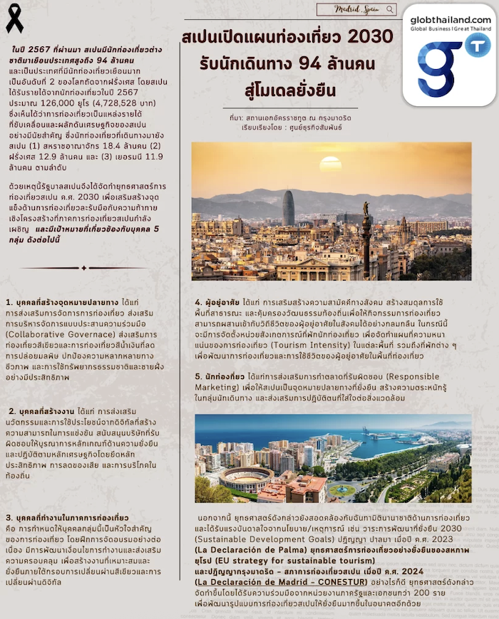 ซึ่งเห็นได้ว่าการท่องเที่ยวเป็นแหล่งรายได้ที่ขับเคลื่อนและผลักดันเศรษฐกิจของสเปนอย่างมีนัยสำคัญ ซึ่งนักท่องเที่ยวที่เดินทางมายังสเปน (1) สหราชอาณาจักร 18.4 ล้านคน (2) ฝรั่งเศส 12.9 ล้านคน และ (3) เยอรมนี 11.9 ล้านคน ตามลำดับ ด้วยเหตุนี้รัฐบาลสเปนจึงได้จัดทำยุทธศาสตร์การท่องเที่ยวสเปน ค.ศ. 2030 เพื่อเสริมสร้างจุดแข็งด้านการท่องเที่ยวละรับมือกับความท้าทายเชิงโครงสร้างที่ภาคการท่องเที่ยวสเปนกำลังเผชิญ อาทิ ประเด็นเรื่องสิ่งแวดล้อม การปรับตัวสู่ดิจิทัล การปรับปรุงเงื่อนไขการจ้างงาน เป็นต้น