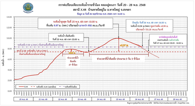 (2)ระดับน้ำสูงสุดเป็นประวัติการณ์: เมื่อวันที่ 25 พฤศจิกายน 2568 ระดับน้ำที่สถานี X.44 (บริเวณอำเภอหาดใหญ่) วัดความสูงได้ถึง 9.97 เมตร ซึ่งเป็นระดับน้ำที่สูงที่สุดที่เคยมีมา แซงสถิติเดิมเมื่อปี 2553 ที่ 9.10 เมตร