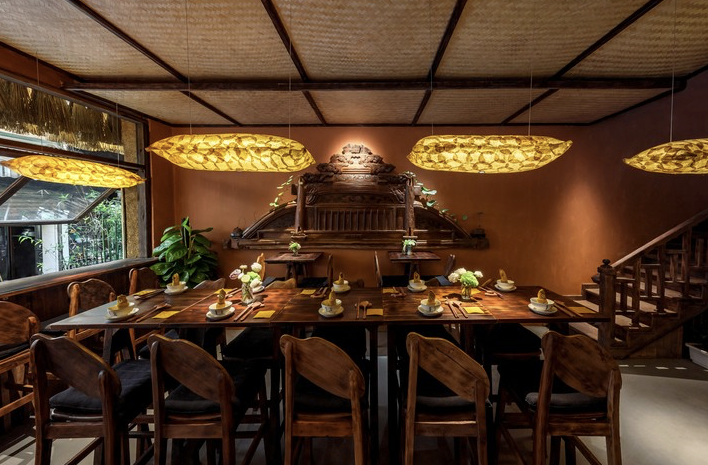 การตกแต่งภายในรวมถึงโคมไฟข้าว โคมไฟกระสอบข้าว และ loong lua - ผู้ถือข้าวของชาว Tay ทุกรายละเอียดหมายถึงข้าว จิตวิญญาณของร้านอาหาร