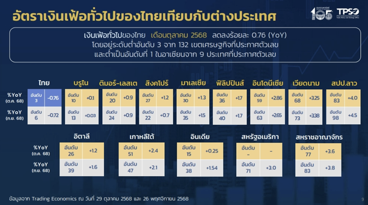 อัตราเงินเฟ้อทั่วไปของไทยเมื่อเทียบกับต่างประเทศ ข้อมูลล่าสุดเดือนตุลาคม 2568 พบว่า อัตราเงินเฟ้อทั่วไปของไทยลดลงร้อยละ 0.76 (YOY) โดยอยู่ระดับต่ำอันดับ 3 จาก 132 เขตเศรษฐกิจที่ประกาศตัวเลข และต่ำสุดในกลุ่มประเทศอาเซียน 9 ประเทศที่ประกาศตัวเลข เช่น บรูไน ติมอร์-เลสเต สิงคโปร์ มาเลเซีย ฟิลิปปินส์ อินโดนีเซีย เวียดนาม และ สปป.ลาว