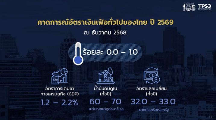 เงินเฟ้อไทย เดือนพฤศจิกายน 2568 ลดลง 0.49% สาเหตุจากราคาพลังงาน ค่าไฟ ลดลง รวมไปถึงมาตรฐานลดภาระค่าครองชีพของภาครัฐ ทำให้ 11 เดือนปีนี้ ลดลง 0.12% ต่อเนื่อง 8 เดือนติดต่อกัน ขณะที่คาดการณ์ว่าแนวโน้มอัตราเงินเฟ้อทั่วไปปี 2569 จะอยู่ระหว่าง 0.0-1.0% โดยมีค่ากลางอยู่ที่ 0.5%