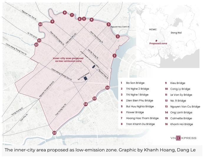 ตามข้อเสนอของที่ปรึกษา เขตปล่อยมลพิษต่ําในพื้นที่ด้านในจะครอบคลุมเขตเดิมของ 1, 3, 5, 6, 8, 10, 11, Binh Thanh, Tan Binh, Tan Phu และ Phu Nhuan ซึ่งล้อมรอบด้วยสะพาน 15 แห่งและถนนสายหลัก 17 แห่ง