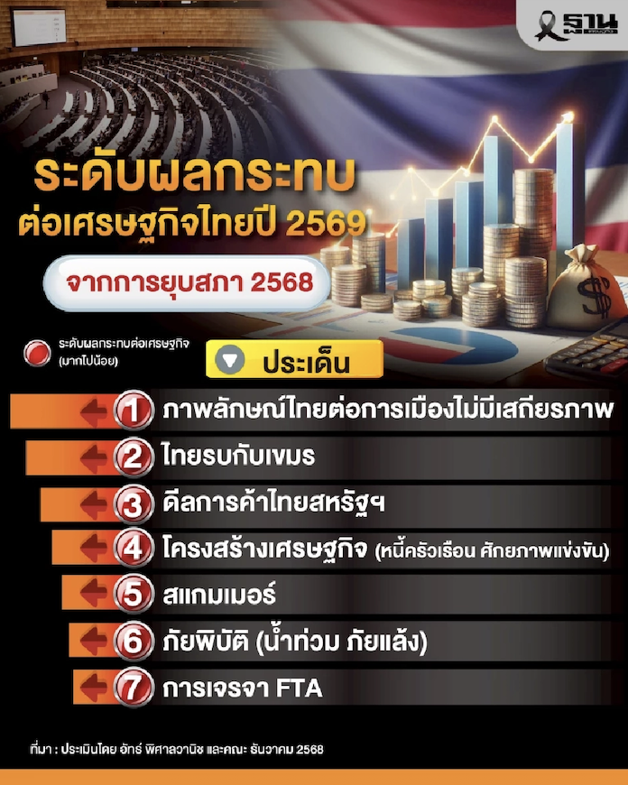 โดยระบุว่า พระราชกฤษฎีกา ยุบสภาเมื่อวันที่ 11 ธันวาคม 2568 จะส่งผลกระทบต่อเศรษฐกิจไทยในทิศทางที่แย่ลงต่อปัญหาเศรษฐกิจที่มีอยู่เดิม และยังแก้ไม่ได้ เศรษฐกิจไทยจะเริ่มนับหนี่งกันใหม่ หลังจากมีรัฐบาลใหม่ (น่าจะอยู่ในเดือน พฤษภาคม หรือ มิถุนายน 2569) ซึ่งไม่แน่ใจว่าหน้าตาของรัฐบาลใหม่จะเป็นพรรคใด และนโยบายเศรษฐกิจจะไปในทิศทางใด การยุบสภาครั้งนี้ จะส่งผลโดยตรงต่อเศรษฐกิจไทยใน 7 ประเด็นคือ