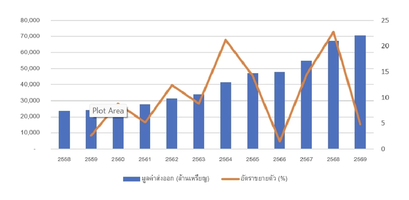 “ปี 2569 ส่งออกไทยไปสหรัฐ คาดว่า มูลค่าอยู่ที่ 70,540 ล้านดอลลาร์สหรัฐ จากปี 2568 คาดการณ์ว่าการส่งออกไทยไปสหรัฐ มีมูลค่า 67,312 ล้านดอลลาร์ ขยายตัว 22.7% นอกจากในปี 2569 ไทยต้องเจอกับภาษีเฉพาะในตลาดสหรัฐฯ อีกหลายรายการ ที่เป็นตามกฎหมายเฉพาะของสหรัฐฯ เช่น กฎหมาย Tariff Act of 1930 (Section 701, 731, 781) Trade Act of 1974 (Section 301) Trade Expansion Act of 1962 (Section 232) กฎหมายการค้าปี 1974 (Section 122) ซึ่งอนุญาตให้เก็บภาษี 15% กฎหมายศุลกากรปี 1930 (Section 388) ซึ่งเปิดทางให้เก็บภาษีสูงสุด 50% จากประเทศที่เลือกปฏิบัติต่อสินค้าสหรัฐฯ แทนที่ภาษีตอบโต้ (Reciprocal Tariff) มูลค่าสินค้าส่งออกไทยที่มีโอกาสใด้รับผลกระทบที่จะส่งไปสหรัฐฯ เท่ากับ 8.1 พันล้านดอลลาร์ หรือประมาณ 2.6 แสนล้านบาท”