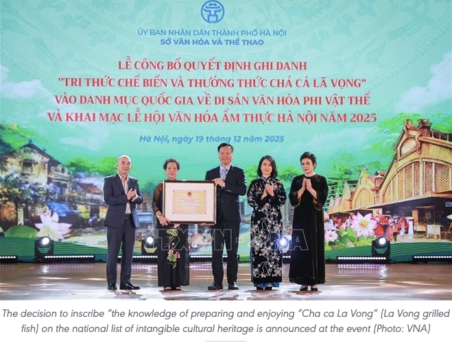 ในพิธีเปิด คณะกรรมการจัดงานได้ประกาศการตัดสินใจของกระทรวงวัฒนธรรม กีฬา และการท่องเที่ยวที่จะจารึก “ความรู้ในการเตรียมและเพลิดเพลินไปกับ “Cha ca La Vong” (ปลาย่างลาหว่อง) ในรายชื่อมรดกทางวัฒนธรรมที่จับต้องไม่ได้แห่งชาติ มรดกได้รับการเก็บรักษาไว้และสืบทอดผ่านหกชั่วอายุคนของครอบครัว Doan บนถนน Cha Ca ในปัจจุบัน กลายเป็นวัฒนธรรมการทําอาหารที่โดดเด่นของฮานอย