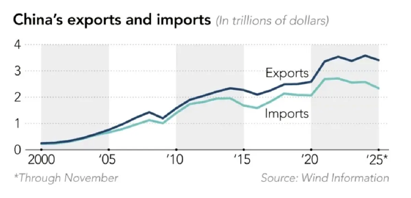 แม้จะมีเสียงกังวลเรื่องสงครามภาษีจากฝั่งประธานาธิบดี “โดนัลด์ ทรัมป์” แต่ภาคการส่งออกของจีนก็ยังพิสูจน์ให้เห็นว่ายังแข็งแกร่ง โดยในช่วงปลายปีที่แล้ว ยอดส่งออกเติบโตขึ้น 5.4% และด้วยยอดการนำเข้าที่ลดลง จึงทำให้จีนทำสถิติ "เกินดุลการค้า" สูงเป็นประวัติการณ์ถึง 1 ล้านล้านดอลลาร์