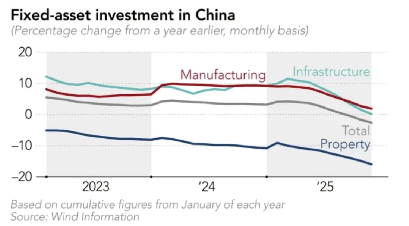 ปัจจุบันการลงทุนในสินทรัพย์ถาวรของจีนมีแนวโน้มลดลงเป็นครั้งแรกนับตั้งแต่ปี 1989 โดยในช่วงปี 2025 ที่ผ่านมาหดตัวลง 2.6% ซึ่งตัวการหลักคือ "ภาคอสังหาริมทรัพย์" ที่ดิ่งลงถึง 16% แม้แต่การลงทุนในโรงงานและโครงสร้างพื้นฐานที่เคยรุ่งเรืองก็เริ่มแผ่วลง