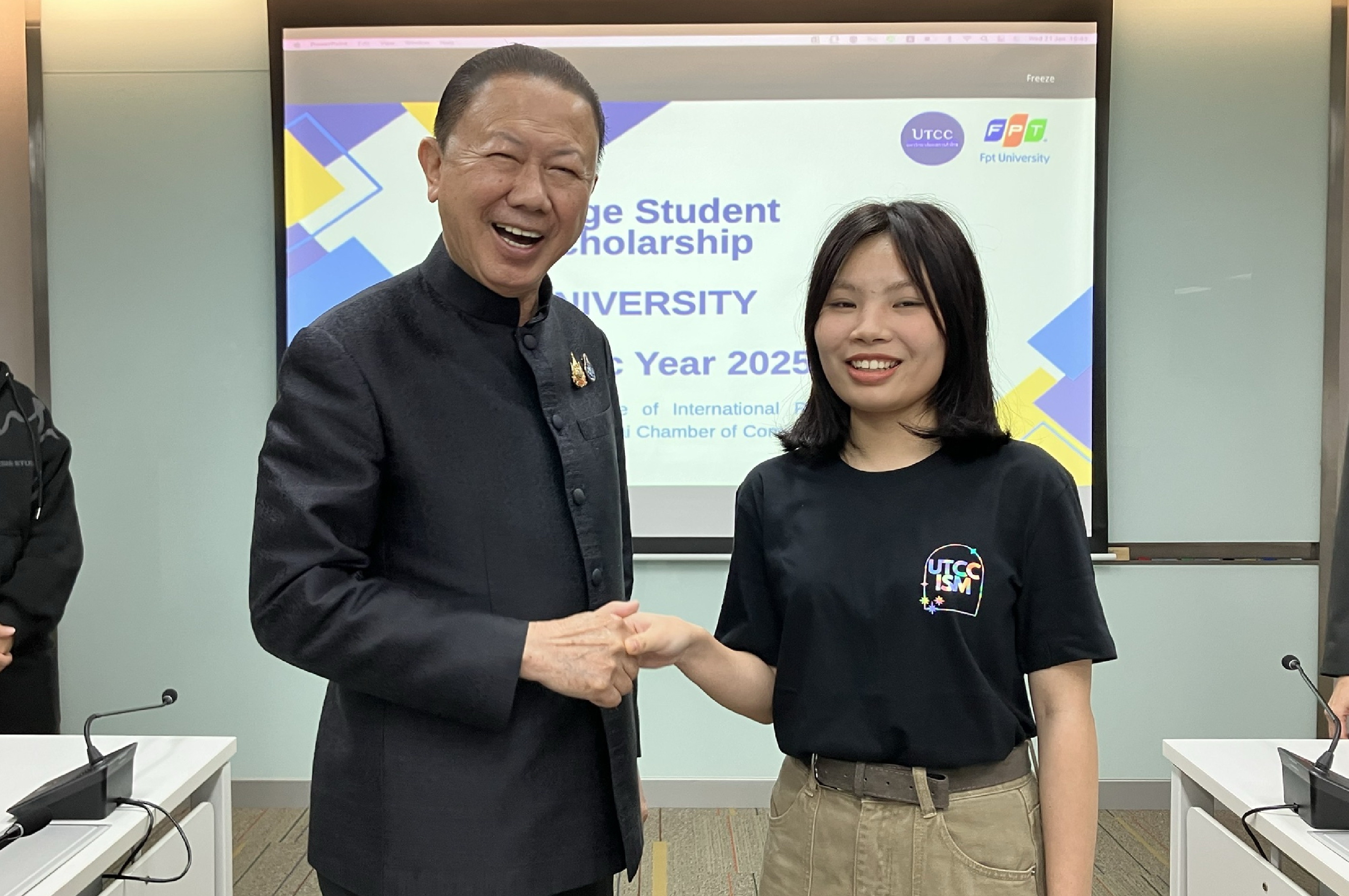 วันพุธที่ 21 มกราคม 2569 คุณสนั่น อังอุบลกุล นายกสมาคมมิตรภาพไทย-เวียดนาม และที่ปรึกษากิตติมศักดิ์สภามหาวิทยาลัยหอการค้าไทย เป็นประธานในพิธีมอบทุนการศึกษาให้แก่ Ms. Le Mai Anh นักศึกษาแลกเปลี่ยนจาก FPT University ประเทศเวียดนาม เพื่อเข้าศึกษาในหลักสูตรบริหารธุรกิจบัณฑิต (หลักสูตรนานาชาติ) ณ วิทยาลัยนานาชาติเพื่อการจัดการ มหาวิทยาลัยหอการค้าไทย