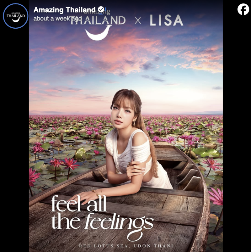 และเมื่อไม่กี่สัปดาห์ที่ผ่านมา เฟซบุ๊กแฟนเพจ Amazing Thailand ของ ททท. มีการเปิดตัวโปรโมต Amazing Thailand x LISA อย่างเป็นทางการ ภายใต้ tagline ที่ว่า “สัมผัสถึงทุกความรู้สึกที่เมืองไทย Feel all the Feelings”