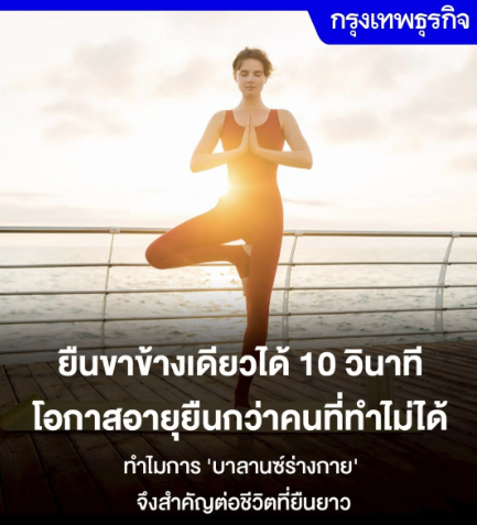 * งานวิจัยพบว่าผู้ที่ไม่สามารถยืนขาเดียวได้นาน 10 วินาที มีความเสี่ยงเสียชีวิตก่อนวัยอันควรสูงกว่าคนที่ทำได้ถึง 84%
