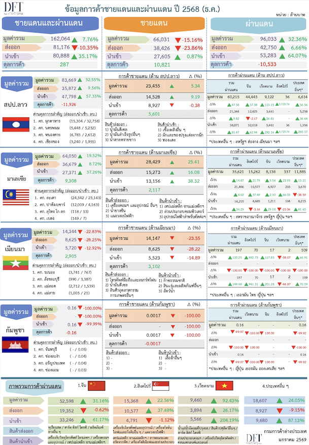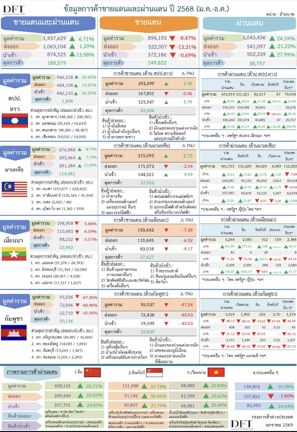 การค้าชายแดน-ผ่านแดนปี 2568 มูลค่าการค้ารวม 1,937,629 ล้านบาท ขยายตัว 6.7% ผลจากผ่านแดนสูงเป็นประวัติการณ์กว่า 1.04 ล้านล้านบาท บวก 24.4% ส่งผลดีภาพรวม ปี 2569 รุกกิจกรรมเต็มที่