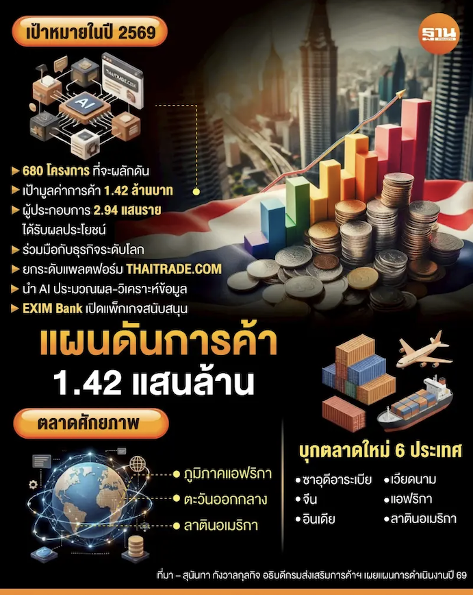 * กรมส่งเสริมการค้าระหว่างประเทศตั้งเป้าปี 2569 สร้างมูลค่าการค้า 1.42 แสนล้านบาท ผ่านการดำเนินโครงการและกิจกรรมกว่า 680 โครงการ