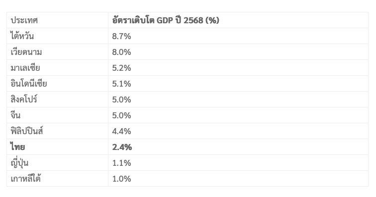 ตัดภาพมาที่ประเทศไทย สื่อการเงินระดับโลกอย่าง The Financial Time กลับยกให้เป็น sick man of Asia (คนป่วยของเอเชีย) ที่ยังไม่ฟื้น ท่ามกลางเพื่อนบ้านที่กำลังวิ่งมาราธอนด้วยความเร็วสูง มีพัฒนาการที่ดีขึ้นทุกปี GDP ของประเทศไทยในปี 2026 นี้กลับถูกคาดการณ์ว่าจะขยายตัวอยู่เพียงระดับ 2.5% – 2.8% เท่านั้น (อ้างอิงกรอบประมาณการศักยภาพเศรษฐกิจระยะยาวโดยสภาพัฒน์และ ธปท.)