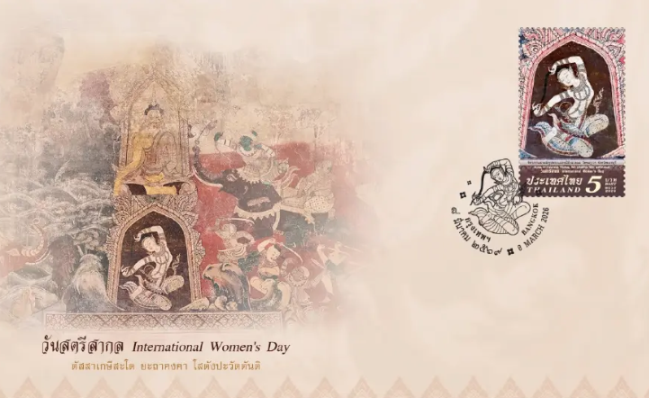 สำหรับแสตมป์ที่ระลึกชุดวันสตรีสากล 2569 ได้นำเสนอภาพ “พระแม่ธรณีบีบมวยผม” จากจิตรกรรมฝาผนังพระอุโบสถ วัดชมภูเวก สื่อถึงพลัง ความมั่นคง และคุณค่าผ่านบทบาทของสตรีผ่านสัญลักษณ์ทางศิลปกรรมไทยอันทรงคุณค่า ภาพพระแม่ธรณีในท่วงท่าบีบมวยผมถือเป็นภาพแทนแห่งความเข้มแข็ง การยืนหยัดในความถูกต้อง และการปกป้องคุณธรรม
