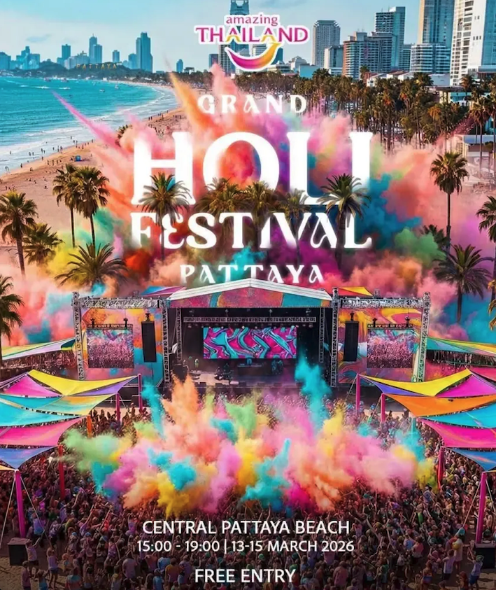 Holi Festival Pattaya 2026 เทศกาลสาดสี ครั้งที่ 4 เริ่มวันนี้ 13-15 มีนาคม 2569 เช็กเลยจัดที่ไหน เข้าฟรีหรือไม่ มีไฮไลต์อะไรบ้าง