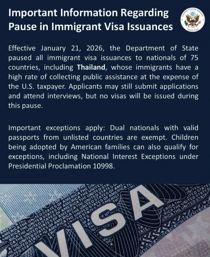 สถานเอกอัครราชทูตสหรัฐอเมริกาประจำประเทศไทย แจงประเทศสหรัฐอเมริกา ระงับการออกวีซ่าถาวรทั้งหมด กับผู้ที่มีสัญชาติจาก 75 ประเทศ รวมถึง "ประเทศไทย" เริ่มตั้งแต่วันที่ 21 มกราคม 2569 เป็นต้นไป ยกเว้น 2 กลุ่ม