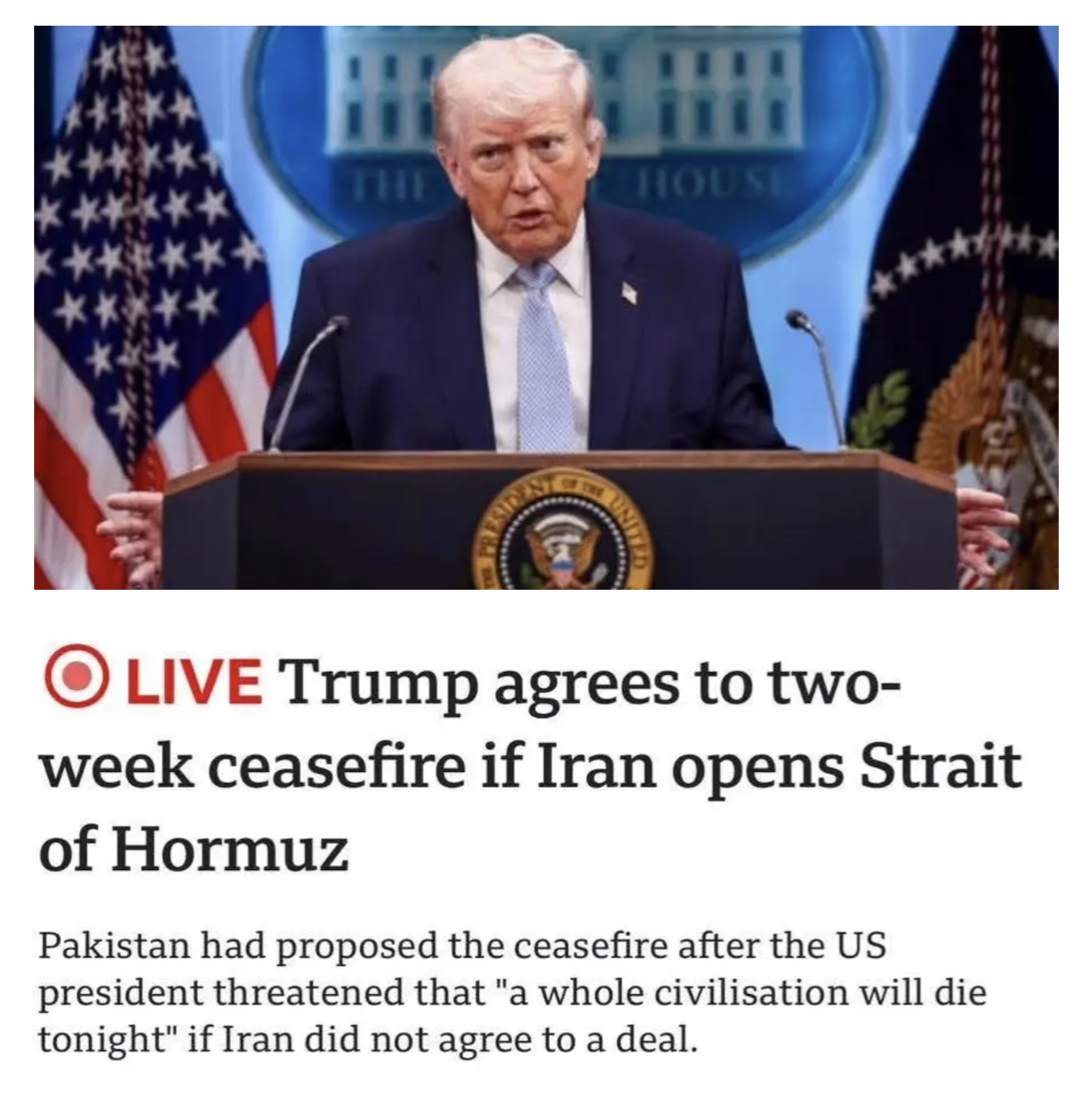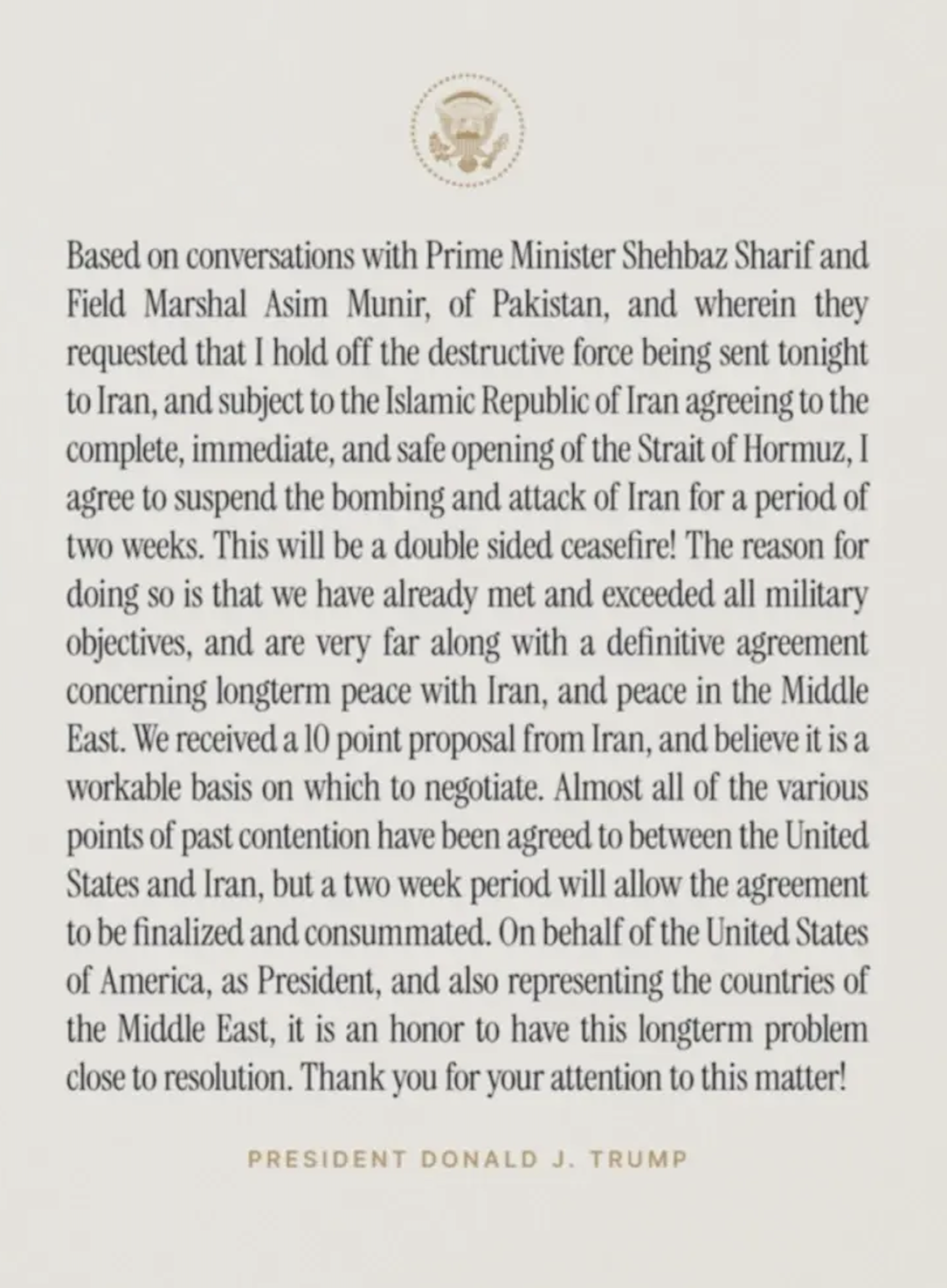 ผมจึงตกลงที่จะระงับการทิ้งระเบิดและการโจมตีอิหร่านเป็นเวลา 2 สัปดาห์ นี่จะเป็นการ ‘หยุดยิง’ ทั้งสองฝ่าย!