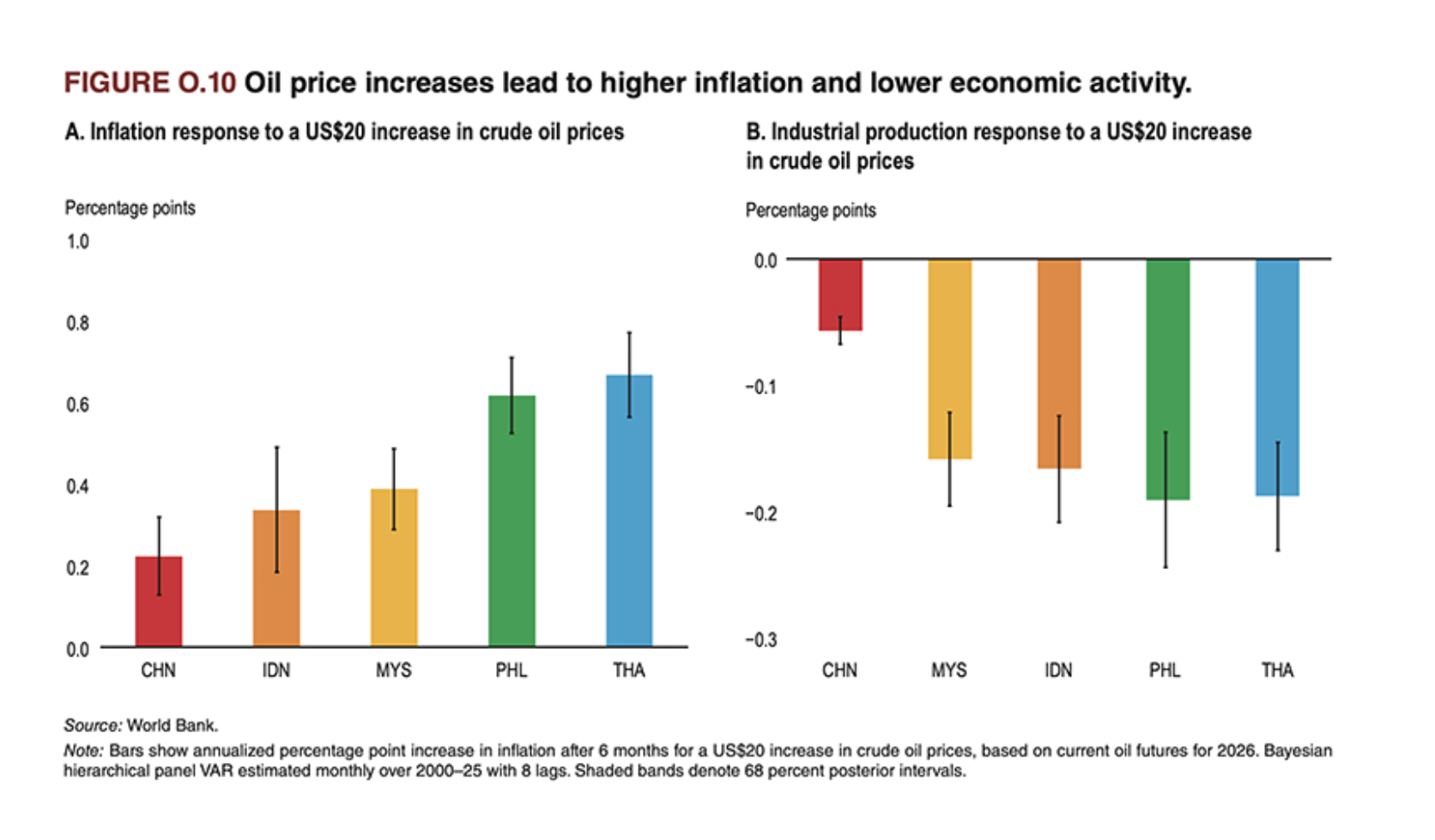 ธนาคารโลกอธิบายต่อว่า ราคาน้ำมันที่สูงขึ้นจะส่งผลต่อแรงกดดันเงินเฟ้อและฉุดรั้งกิจกรรมทางเศรษฐกิจมากน้อยเพียงใดนั้น ขึ้นอยู่กับระดับการเปิดรับความเสี่ยง (Exposure) ความเปราะบาง และพื้นที่ดำเนินนโยบาย โดยราคาน้ำมันที่สูงขึ้นส่งผ่านไปยังเงินเฟ้อผ่าน 2 ช่องทางหลัก ได้แก่