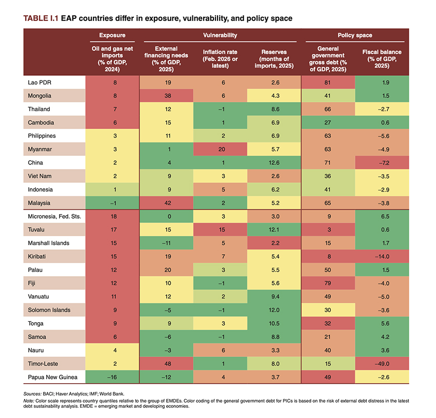ธนาคารโลกยังระบุว่า ผลกระทบจากภาวะวิกฤตราคาพลังงาน (Energy Price Shock) จะมีความแตกต่างกันไป โดยขึ้นอยู่กับขีดความสามารถในการตอบสนองของแต่ละประเทศด้วย โดยกลุ่มที่เปราะบางที่สุดคือประเทศหมู่เกาะในแปซิฟิก (ได้แก่ ฟิจิ ตองกา วานูอาตู และไมโครนีเซีย) รวมถึงประเทศผู้นำเข้าอย่าง ไทยและมองโกเลีย ซึ่งกำลังเผชิญกับแรงกดดันมหาศาลต่อดุลการค้า มีพื้นที่ทางการคลัง (Fiscal Buffers) ที่จำกัด