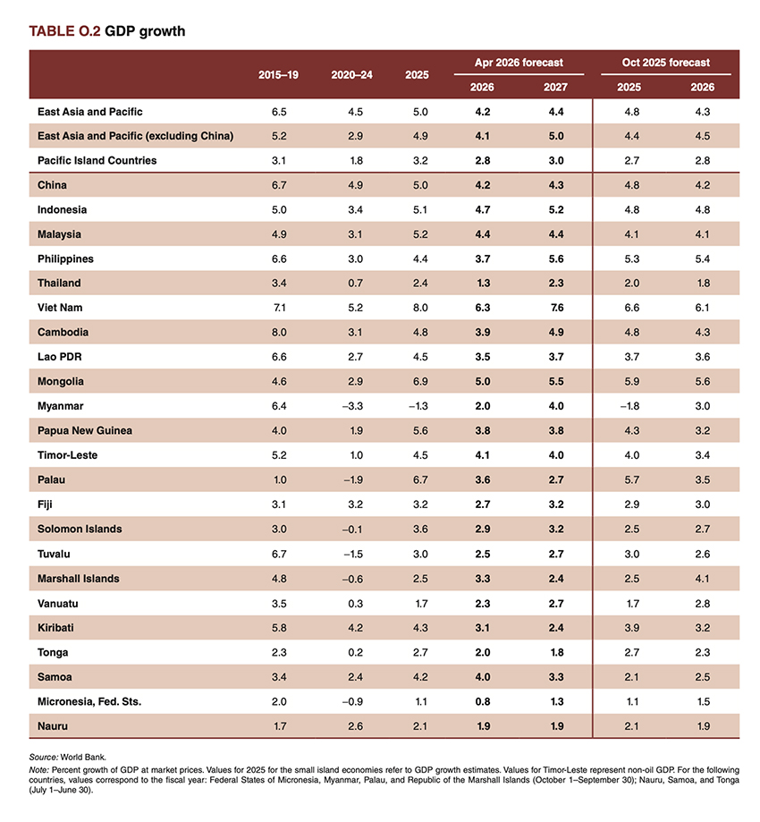 ธนาคารโลกยังคาดว่า เศรษฐกิจในภูมิภาคคาดว่าจะขยายตัวในอัตราที่ชะลอลงเหลือ 4.2% ในปี 2569 จาก 5.0% ในปี 2568 โดยเป็นผลจากวิกฤตการณ์ด้านพลังงานที่มีสาเหตุมาจากความขัดแย้งในตะวันออกกลาง ซึ่งทำให้ผลกระทบเชิงลบจากมาตรการกีดกันทางการค้าที่อยู่ในระดับสูง ความไม่แน่นอนของนโยบายเศรษฐกิจโลก และปัญหาเศรษฐกิจภายในประเทศยิ่งทวีความรุนแรงขึ้น