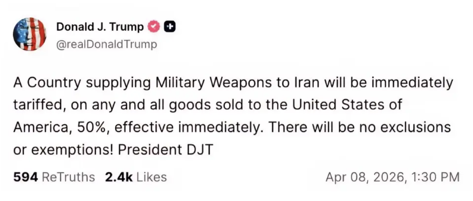“ประเทศใดก็ตามที่จัดหาอาวุธทางทหารให้แก่อิหร่าน จะถูกเรียกเก็บภาษีศุลกากร 50% สำหรับสินค้าทุกชนิดที่จำหน่ายให้แก่สหรัฐอเมริกาโดยทันที โดยไม่มีข้อยกเว้นหรือการผ่อนผันใดๆ ทั้งสิ้น!”