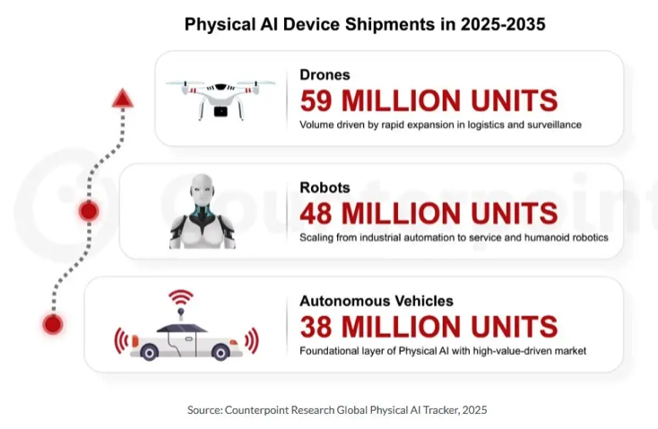 รายงานของ Counterpoint Research ระบุว่า การบรรจบกันของเทคโนโลยีหุ่นยนต์ เอดจ์คอมพิวติ้ง Generative AI รวมถึงระบบภาพและเซ็นเซอร์ กำลังเร่งให้ AI สามารถรับรู้และโต้ตอบกับสภาพแวดล้อมได้จริง ส่งผลให้ตลาดเข้าสู่ช่วงเร่งการเติบโต